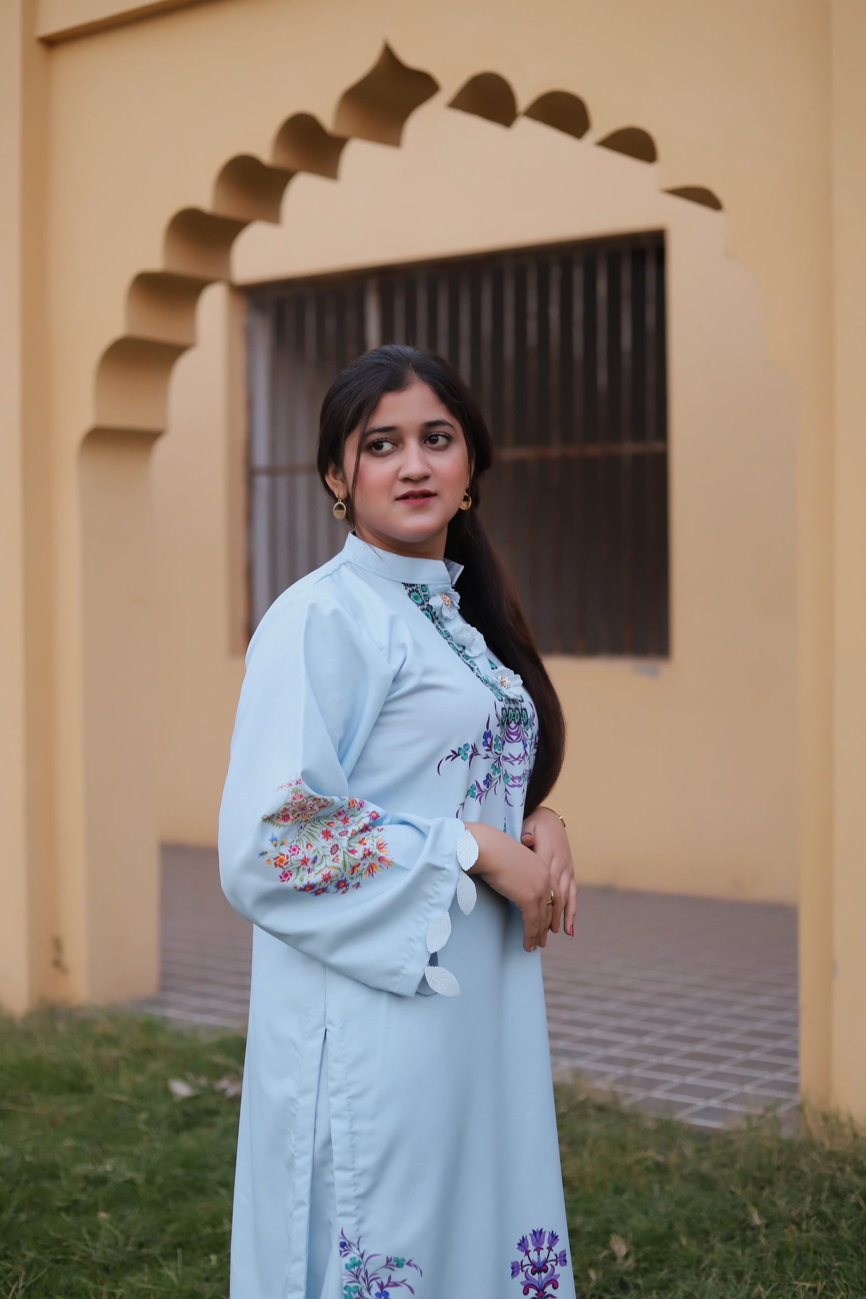 Instruction: All dresses come with sleeves when ordered stitched, sleeveless is for shoot purpose only unless requested by the customer.